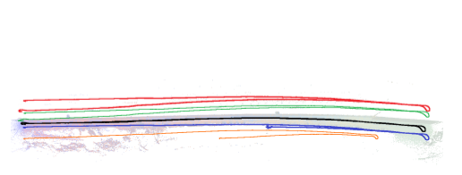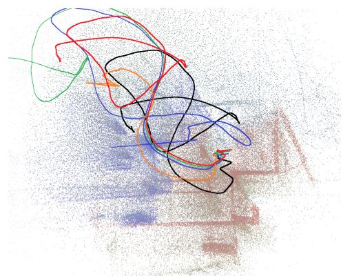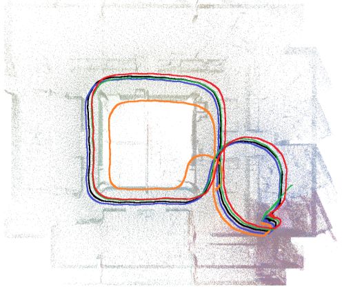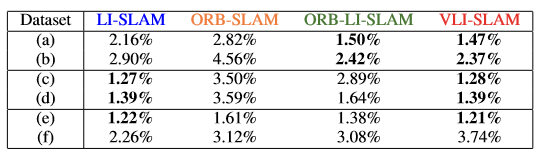 图3为不同方法在不同环境下表现的定性对比结果。其中蓝色线条表示LI-SLAM、橙色线条表示ORB-SLAM、绿色线条表示ORB-LI-SLAM、红色线条表示VLI-SLAM。