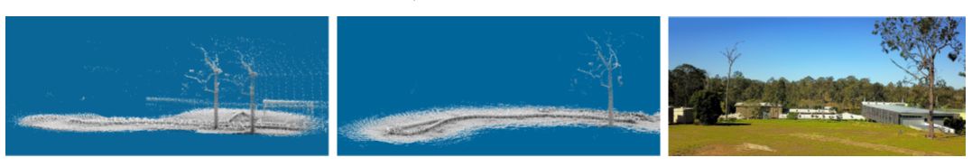 图1 本文方法的SLAM效果展示(中),左图为激光雷达和惯组SLAM结果。场景范围约60米,几何上比较稀疏,真实场景图(右)表明阳光很强。