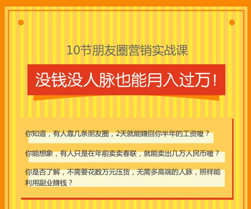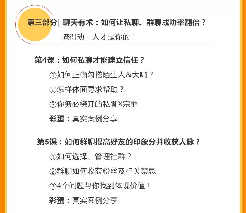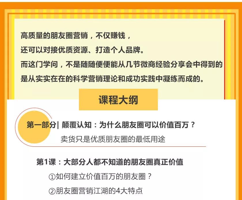 课程中,她将通过真实案例的拆解分析,从如何获取高质量好友、如何让聊天成功率翻倍、如何变现赚钱等五大模块精细讲解朋友圈营销大获成功的干货。