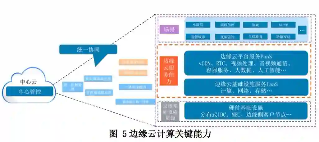 下图展示了边缘云计算的关键能力,其包含统一协同能力和服务能力两大部分。