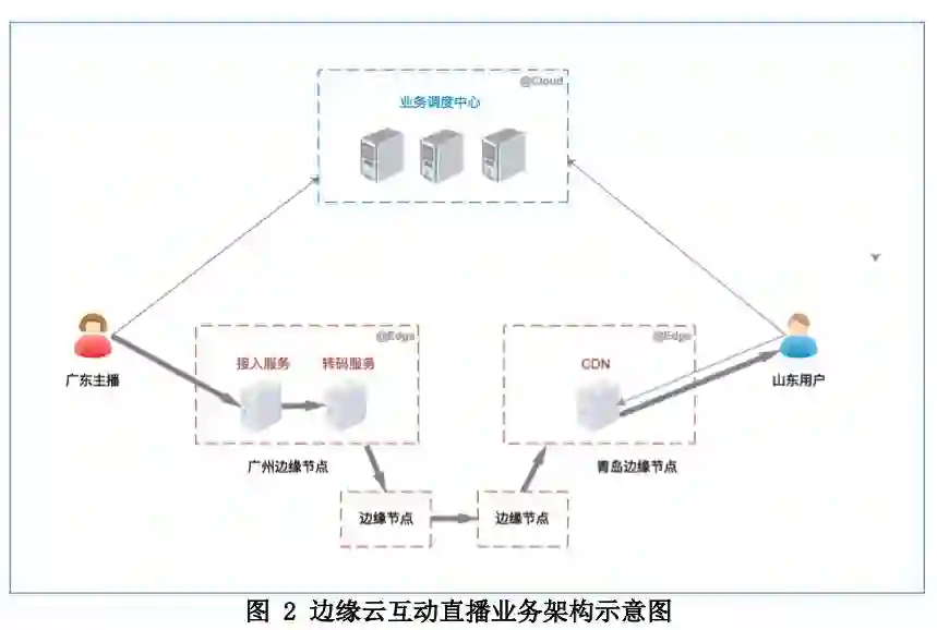 主播的媒体流推送到就近的边缘节点,在边缘节点直接进行转码,转码后的媒体流分发到CDN边缘节点,当有用户访问时就近返回内容。基于边缘节点上的服务、直播流的上下行内容推送以及转码处理等都不用再回中心,大大降低了业务时延,提升了互动体验,同时边缘处理架构对带宽成本的节省也非常明显。