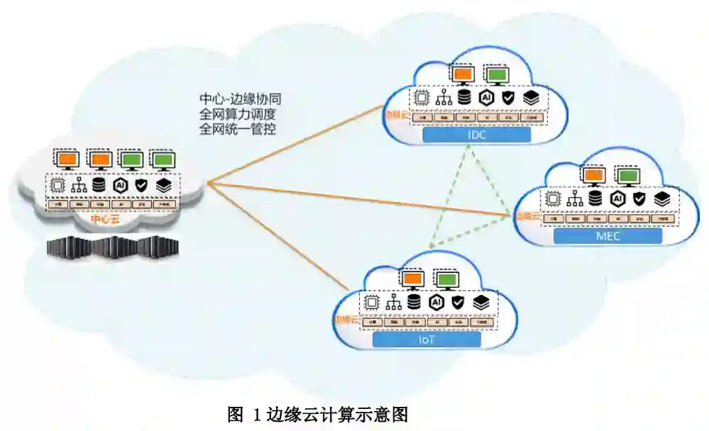 下图表述了边缘云计算的基本概念,中心云和边缘云相互配合,实现中心-边缘协同、全网算力调度、全网统一管控等能力,真正实现“无处不在”的云。