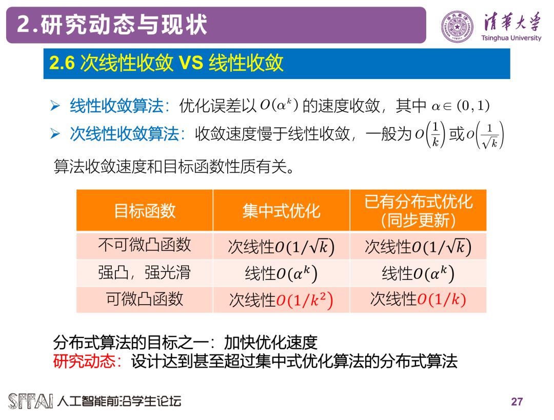最后,算法的收敛速度始终是优化算法非常关心的一个问题,下图列出了目前最好的集中式优化算法和分布式优化算法的收敛速度比较。