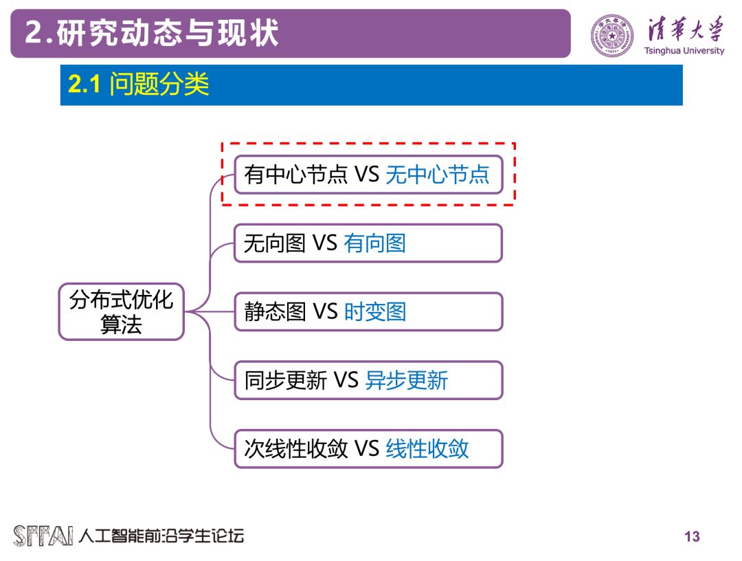 分布式优化算法是目前的一个研究热点,且随着单硬件计算能力发展放缓,采用多硬件加速网络的训练会越来越成为以后的主流。在这种情况下,如何设计分布式的算法,保障其收敛性,加快其收敛速度,是一个值得研究的理论问题。本文介绍了目前分布式算法的一些基本概念和研究现状,以及我们提出的一种异步算法AsySPA。总之,分布式优化目前还有很多理论问题需要研究,并且如何跟具体的应用问题结合也是一个重点和难点。