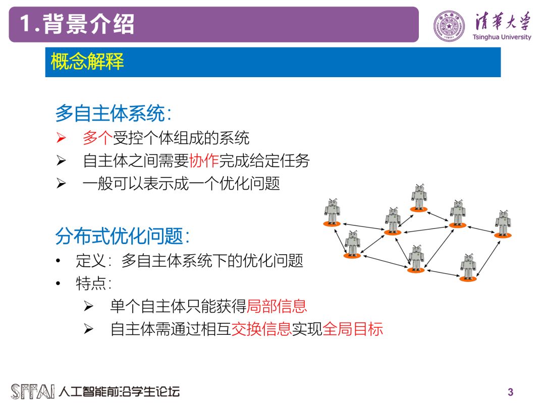 分布式优化问题并没有一个特别明确的定义,根据应用场景的不同具体的形式也有不同,但是主要思想都是采用多个节点来优化全局目标函数。这里的节点可以是CPU, GPU或者服务器,也可以是智能电网中的供电站,无人机编队中的一架无人机,传感器网络中的传感器等。每个节点都有着自己的局部目标函数(损失函数)以及决策变量,而全局目标一般是所有节点上的局部目标函数之和。分布式算法的目标就是通过节点间相互交换信息来使所有节点的决策变量最终收敛于全局目标函数的最小值点。以机器学习为例,分布式优化可以应用于利用多个服务器来优化一个神经网络,其中数据集分布在不同的服务器上,因此每台服务器只能获得一个局部的损失函数。优化算法需要服务器间不断的交换信息。