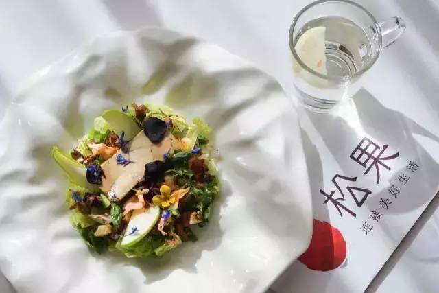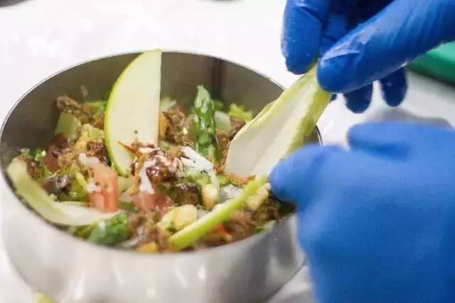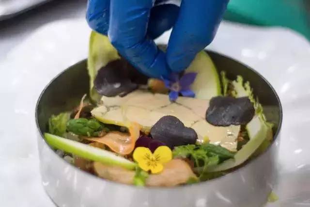 ② 以生菜、芝麻菜、樱桃萝卜作为底菜,放入准备好的鸭胸肉、黑松露和山核桃,点缀青苹果片。