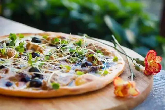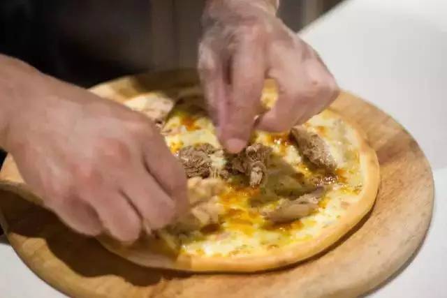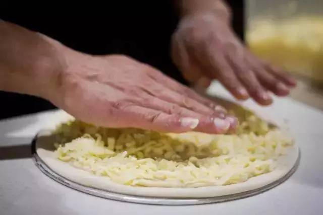 ② 面饼上均匀铺满白披萨酱,以及马苏里拉奶酪;