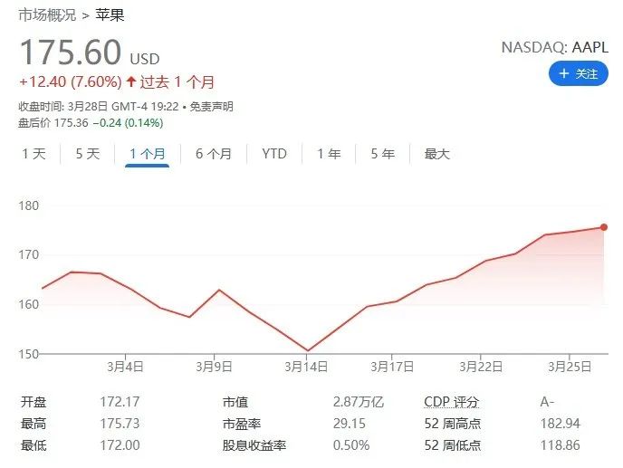 新浪财经消息,在里程碑式的奥斯卡金像奖胜利之后,苹果公司股价周一创下了十多年来最长的连涨纪录。苹果公司股价周一收涨0.5%,报175.60美元,市值2.86万亿美元。截至周一收盘,苹果股价已连续10个交易日上涨,创2010年10月以来的最长连涨纪录,10日累计涨幅16.6%。