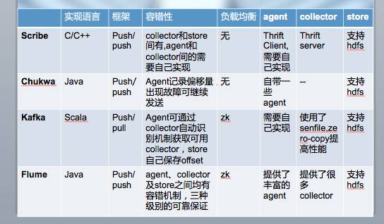 收集:统一日志服务将日志打印在日志服务上之后,需要日志收集机制将其集中起来。目前,常见的日志收集方案有:scribe、Chukwa、Kakfa和Flume。对比如下图所示: