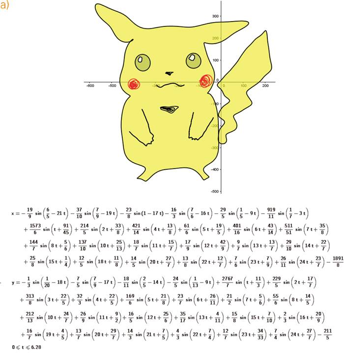 (a) 理查德·克拉克的皮卡丘曲线。这是一个参数方程,t的取值在0到2π之间,曲线上某一点的坐标由(x, y)关于t的函数确定,即(x(t), y(t))。这里只给出了皮卡丘轮廓线的方程,完整的方程是其10倍长。