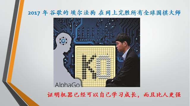 AlphaGo和全球顶尖围棋手的对决,最后的结果是AlphaGo只打平了一局,其他是全胜。AlphaGo已经具有了所谓叫13层神经网络的概念。最核心的是,这个机器可以进行深度学习,它具有自我学习能力,而且自我学习的速度非常快。
