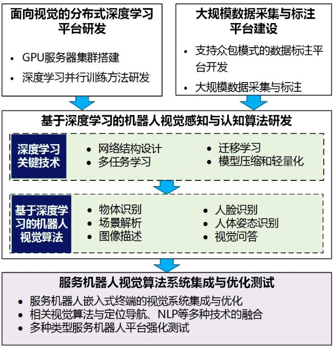 机器人系统技术是对机器人系统软硬件架构和体系的理解。除了伺服舵机、步态运控算法、室内导航定位和机器人操控系统等一系列技术,家庭服务机器人还需要重要的一点,就是通过视觉理解外部环境并且实现与人类交互。