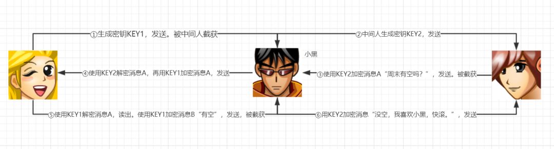 此时,产生了这种情况:客户端使用的是KEY1,服务器使用的是中间人伪造的KEY2,而中间人拥有KEY1,KEY2。所以中间人可以无限篡改数据。