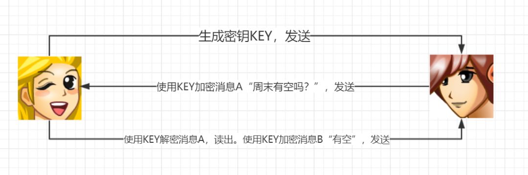 如果使用非对称加密,首先服务器生成一对公钥和私钥,将公钥发送出去;对方收到公钥后,本地使用对称加密生成一个密钥KEY,然后使用公钥加密这个密钥KEY,发送;服务器收到公钥加密的数据后,使用私钥解密,得到KEY。这时,双方可以使用KEY来加密数据,开始安全地交流。 (即使中间人截获了公钥加密的数据,但是由于没有私钥(私钥只有签发公钥的服务器保管,不会用于传输)所以无法解密出KEY。)