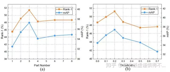 我个人比较关心的retrieved key points数以及判定遮挡点的threshold对reid的效果影响实验文中也有展示,和预期符合的是,并不是点数越多对reid的正面效果越好。