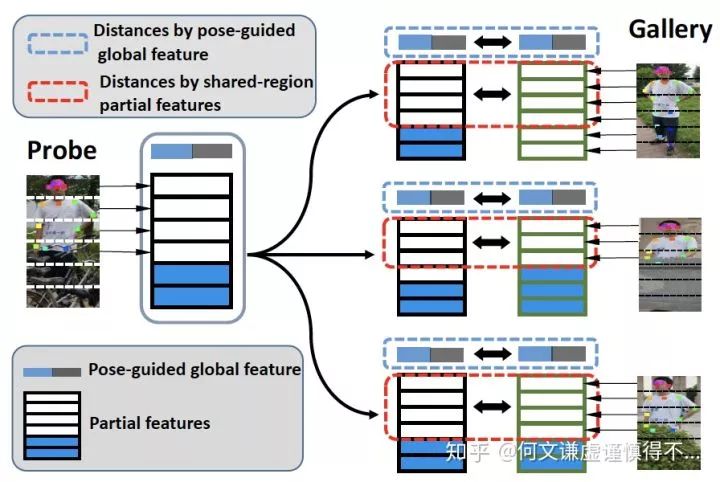 而衡量query与gallery之间的距离则是下图说明。一个query通过网络之后会得到pose guided feature vector和partial feature vectors,query和gallery的pose guided distance很简单,即为两个vector的euclidean distance。而对于partial vector来说呢,只计算未被遮挡部分的对应vector的距离和。判断是否被遮挡的条件是这个part里面是否有retrieved key-point。如果没有则判断是遮挡部分,不参与距离计算。
