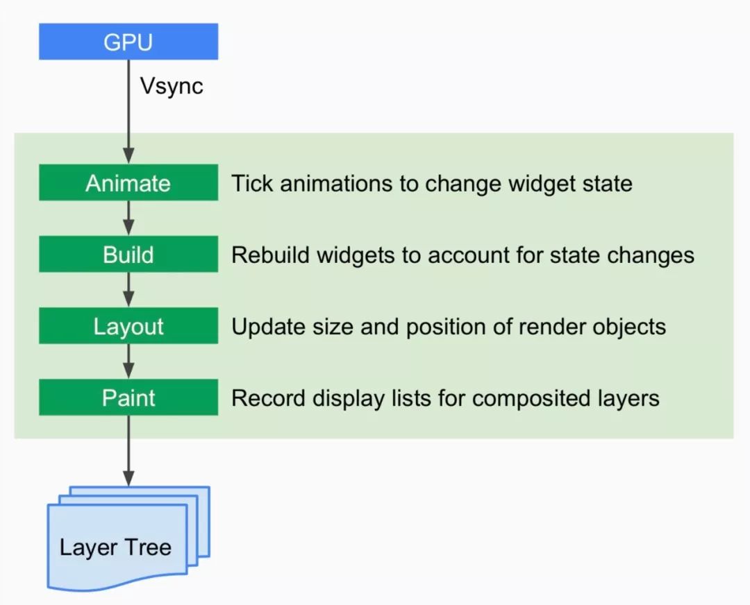 当Root Isolate向Engine提交一次渲染帧时,Engine会等待下次vsync,当下次vsync到来时,由Root Isolate对Widgets进行布局操作,并生成页面的显示信息的描述,并将信息交给Engine去处理。