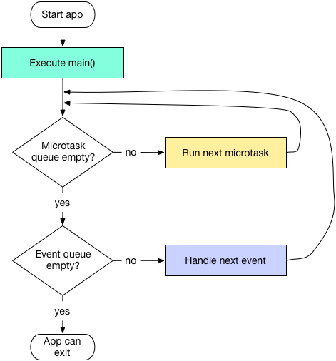 每个isolate包含一个事件循环以及两个事件队列,event loop事件循环,以及event queue和microtask queue事件队列,event和microtask队列有点类似iOS的source0和source1。