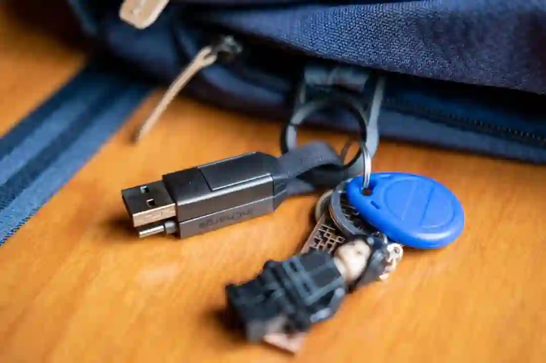 这款钥匙扣数据线采用了磁吸设计,可以方便地收纳携带。我喜欢把它直接挂在单肩包内袋的钥匙环上,既方便找又方便取下使用。