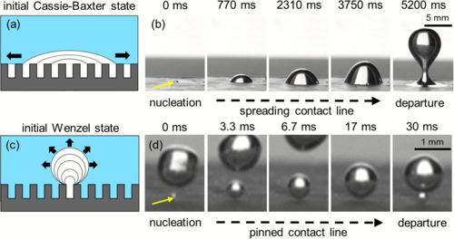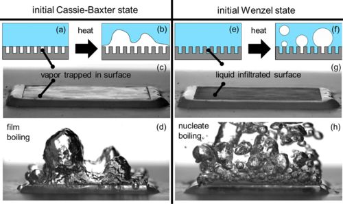 预湿润的超疏水表面结构,会在沸腾期间生成小气泡,也就是说它们不会沿着表面伸展。这些小气泡离开表面的时候不会合并成蒸气层,并且能够保持表面水润。疏水材料也能比亲水材料形成更多的小气泡,让表面更有效地冷却。