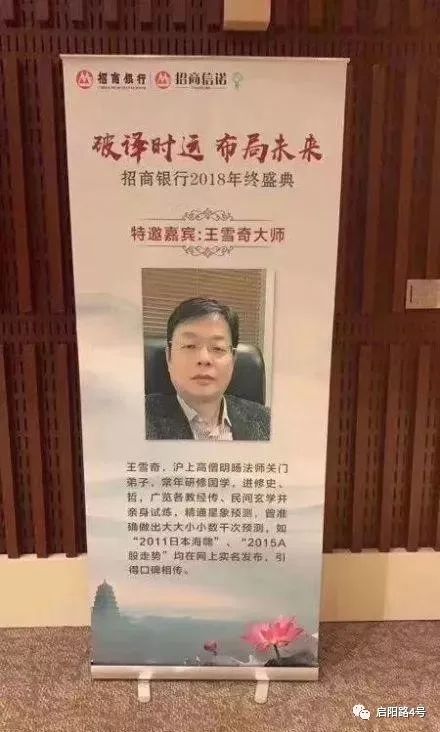 “沪上高僧明旸法师关门弟子,常年研修国学,进修史、哲,广览名教经传、民间玄学并亲身试炼,精通形象预测,曾准确做出大大小小数千次预测,如2011日本海啸、2015A股走势……”竖立在活动现场的展板上如此介绍王雪奇。