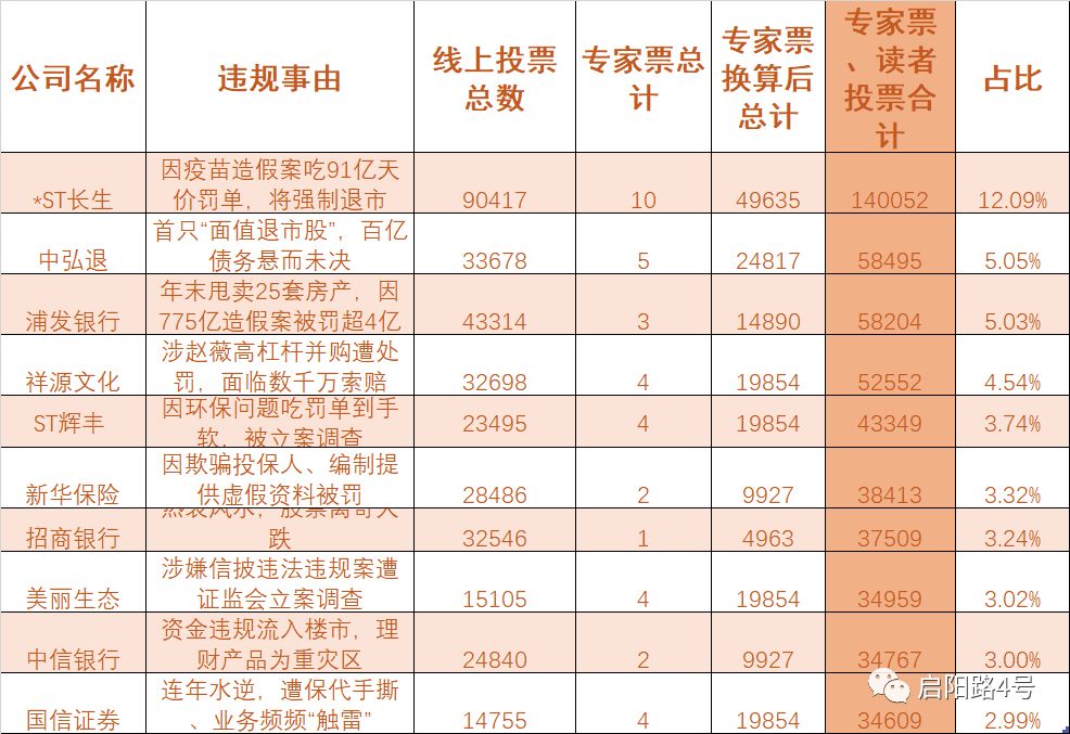 此外,十位参与评选的专家,全部投票给长生生物。专家票换算后,长生生物以12.09%的票选总占比排在第一位,以绝对领先优势成为“2018年A股违规之王”。