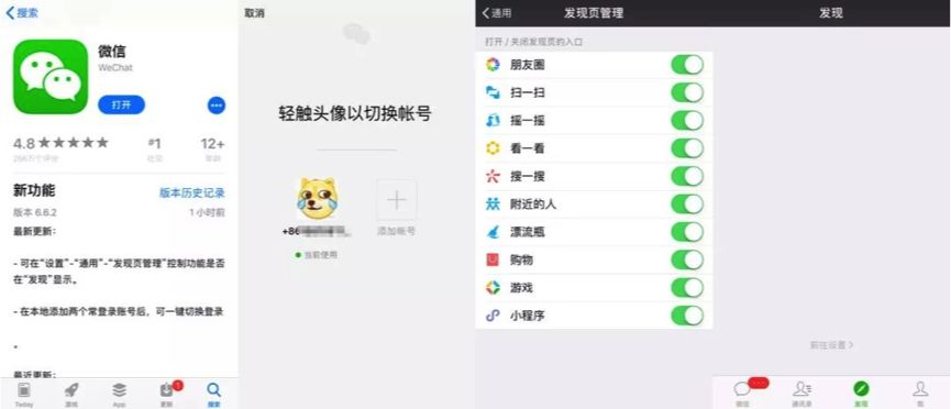 1月31日下午,微信发布iOS端新版本6.6.2,支持账号一键切换登录,以及发现页管理功能。据了解,该版本仅支持切换账号,尚不支持同时接收消息。腾讯公司公关总监张军也在微博表示,发现页管理更应获得掌声,把功能的选择权完全交给用户。