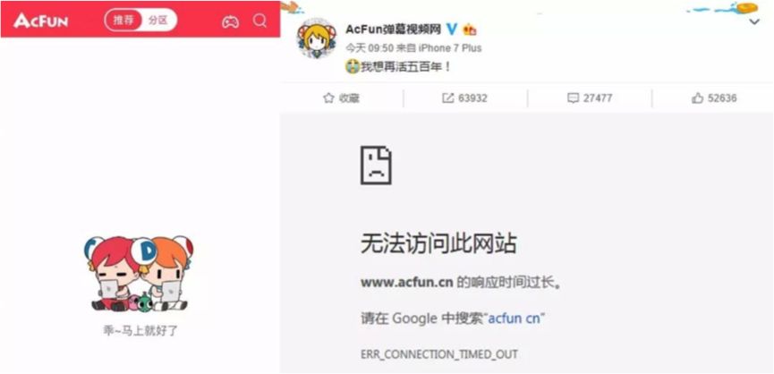 2月2日上午,中国二次元弹幕视频网站AcFun官微发布微博:“我想再活五百年! ”并配了流泪的表情符号,其网站已经无法打开,而A站App也显示“加载失败”。有媒体评论说,A站凉了。早在2月1日,Acfun就被曝融资不畅,员工计划抱团讨薪。但当时A站网站仍能正常访问,且在1日凌晨零点12分,A站官微发布一个“喵喵”表情,似是对传言做出回应。