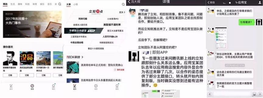 近日,腾讯上线了一款基于兴趣的信息订阅和推送App“立知”。即刻团队员工和知名媒体人冯大辉在朋友圈提到,腾讯应用宝团队曾以提供接口为由,邀请即刻APP入驻应用宝,但转头就对“即刻APP”进行抄袭复刻。2月1日傍晚,腾讯立知下线,APP Store中已搜索不到。腾讯方面回复称:因立知App的功能引起较大争议,暂停内测,下架整改。同时,即刻方面的反应也与此前产生了大反转。即刻CEO瓦恁在朋友圈中表示,腾讯即刻的股东,一直给予即刻帮助。