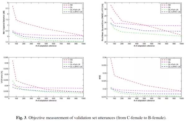 Fig. 4上对比了不同系统间的自然度和相似度。随着句子数的减少,SD系统的性能出现急剧下降,OL+LRPD-LN相比于SD和OL+Full-LN要更加稳定。与客观度量一致,在相同句子数下,OL+Full-LN和OL+LRPD-LN在性能上要优于SD。并且,OL+Full-LN和OL+LRPD-LN在200句话的性能和SD在1000句话时的性能相近。与客观度量不同,OL+LRPD-LN在500句以下的时候性能上就优于OL+Full-LN。这是因为过拟合导致合成出来的声音不稳定(虽然客观度量更优)声音的可懂度下降导致的。由此,我们依然可以得到相同的结论:当自适应句子数较少的时候,过拟合使得OL+Full-LN的性能变差。