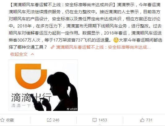 滴滴顺风车下线,多少人春运无眠?同事的婆婆近日回家,这位不接触互联网信息的老人,疑惑的问,为啥滴滴没有顺风车了。
