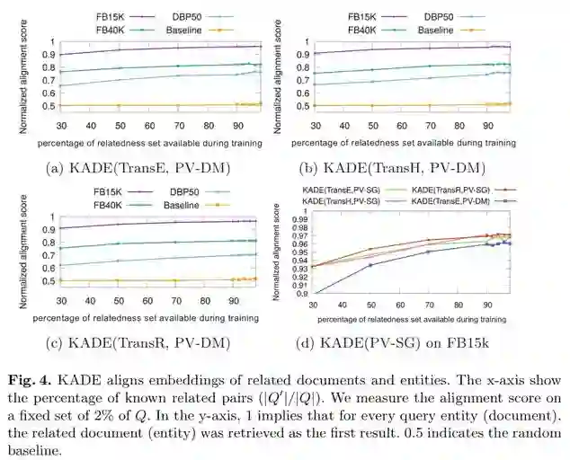 本文还验证了KADE的对齐效果,提出了一个评价对齐效果的指标normalizedalignment score, 这是一个介于0到1之间的值且值越大说明对齐效果越好。我们构造了一个对齐的baseline通过非线性函数实现文本表示学习向量空间和知识图谱表示学习向量空间的互相转换,实验结果如下: