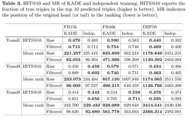 本文的实验主要采用了三个数据集,FB15k, FB40K和DBP50。实验中知识图谱表示学习采用了TransE,TransH 和TransD,并在链接预测任务上进行了测试,实验结果如下并表明了KADE对知识图谱表示学习模型本身的效果没有影响且稍有提升。