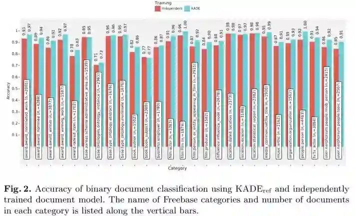 实验中文本表示学习模型采用了PV-DM, 并在文本分类任务上进行了测试,实验结果如下并标明了KADE对文本表示学习模型的效果没有影响且有明显提升。