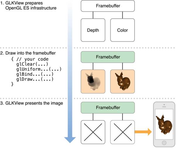 GLKView类自己实现了第一步和第三步。第二步由开发人员来完成,也就是要实现drawRect函数。GLKView之所以能为OpenGL ES提供简单的绘制接口,是因为它管理了OpenGL ES渲染过程的标准部分: