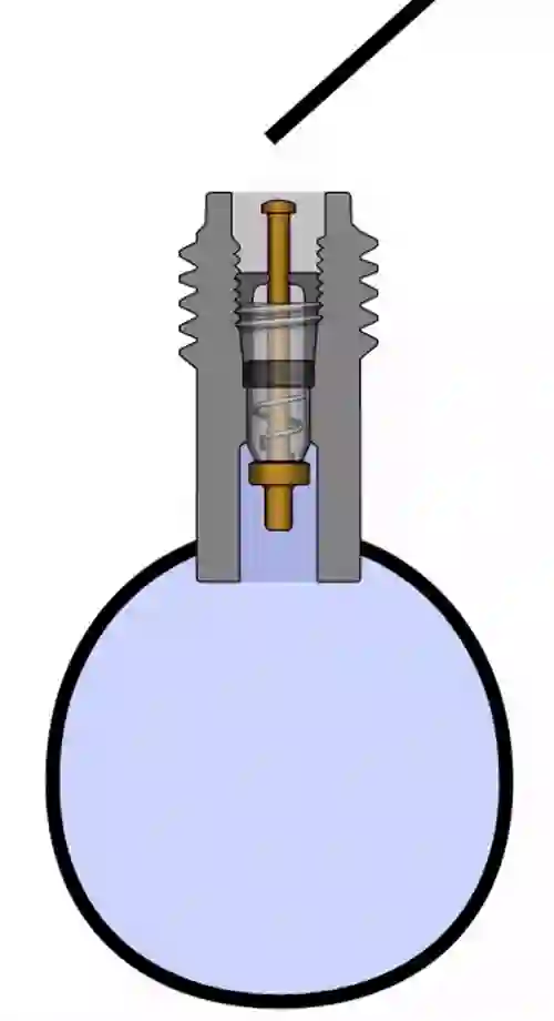 △ 自行车上的气门芯,准确地说是美式气门芯(Schrader valve)的工作原理。打开气门嘴盖后,美式嘴会露出一根具有外螺纹的铜管,里面的空气通道叫作气门嘴本体。本体中间的芯腔锁著一个气芯,气芯里面有一根由螺旋弹簧支撑的芯杆,按下芯杆即可充或泄气。