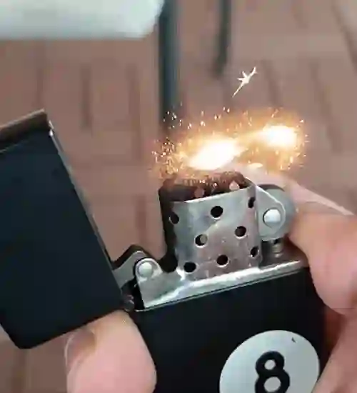 △ 打火石式打火机打火的过程。这种打火机的那圈圆形的转轮和打火石(也叫发火合金,铁铈齐)摩擦,打火石产生火花,火花点燃打火机口部的气态燃料。
