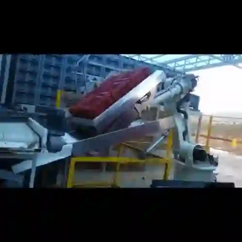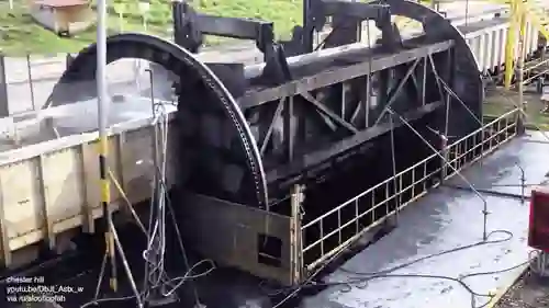 △ 运煤火车在发电厂这样卸货。这种火车的卸货设备叫做转筒式翻车机,它是最常用的铁路翻车机,用于自动卸载没有盖子的火车车厢。