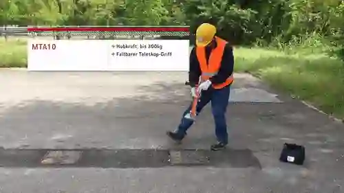 △ 巨重的下水道盖子是怎么用磁性开启工具打开的。