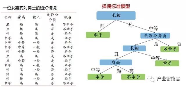 将长相节点分割,以帅和丑作为条件,导致的结果作为其子节点,如分割成牵手和是否公务员;