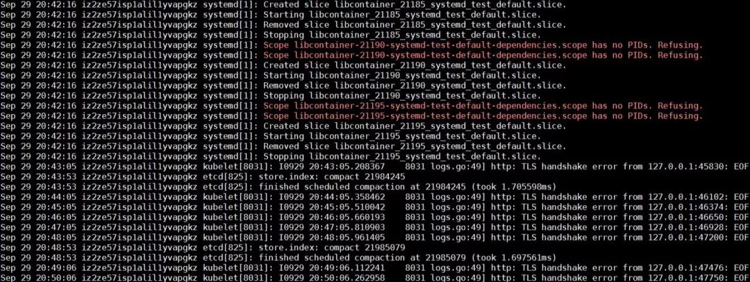 分析问题发生前后的系统日志,runC在重复的跑一个libcontainer_%d_systemd_test_default.slice 测试,这个测试非常频繁,但是当问题发生的时候,这个测试就停止了。所以直觉告诉我,这个问题,可能和这个测试有很大的关系。
