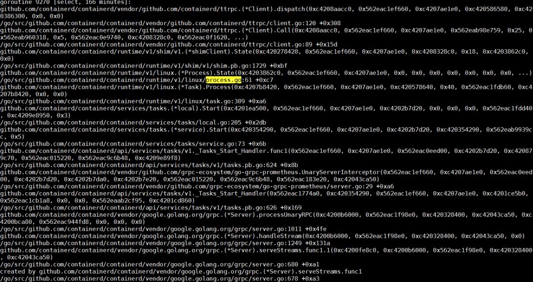 Containerd 作为一个 gRPC 的服务器,会在接到 docker daemon 的远程调用之后,新建一个线程去处理这次请求。关于 gRPC 的细节,我们这里其实不用太多关注。在这次请求的客户端调用栈上,可以看到这次调用的核心函数在 Start 一个Process 。我们在 containerd 的调用栈里搜索 Start,Process 以及 process.go 等字段,很容易发现下边这个线程。