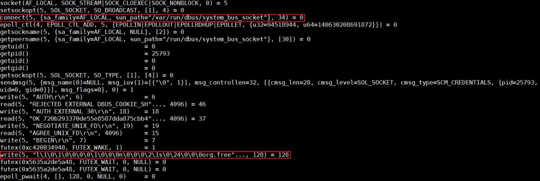 分析发现,runC 停在了向带有 org.free 字段的 dbus socket 写数据的地方。那什么是 dbus 呢?在 Linux 上,dbus 是一种进程间进行消息通信的机制。