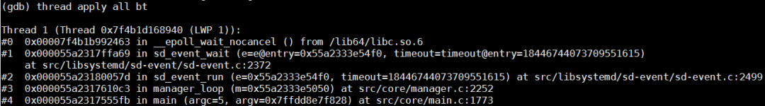 因为重启 systemd 解决了问题,而这个问题本身,是 runC 在使用 dbus 和systemd 通信的时候没有了响应,所以我们需要验证的第一件事情,就是 systemd不是有关键线程被锁住了。查看 core dump 里所有线程,只有以下一个线程,此线程并没有被锁住,它在等待 dbus 事件,以便做出响应。