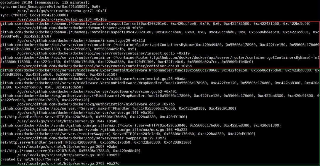 在这个问题中,既然 PLEG 认为容器 runtime 出了问题,我们需要从 docker daemon 进程看起。我们可以使用 kill -USR1 <pid> 命令发送 USR1 信号给docker daemon,而 docker daemon 收到信号之后,会把所有线程调用栈输出到 /var/run/docker 文件夹里。