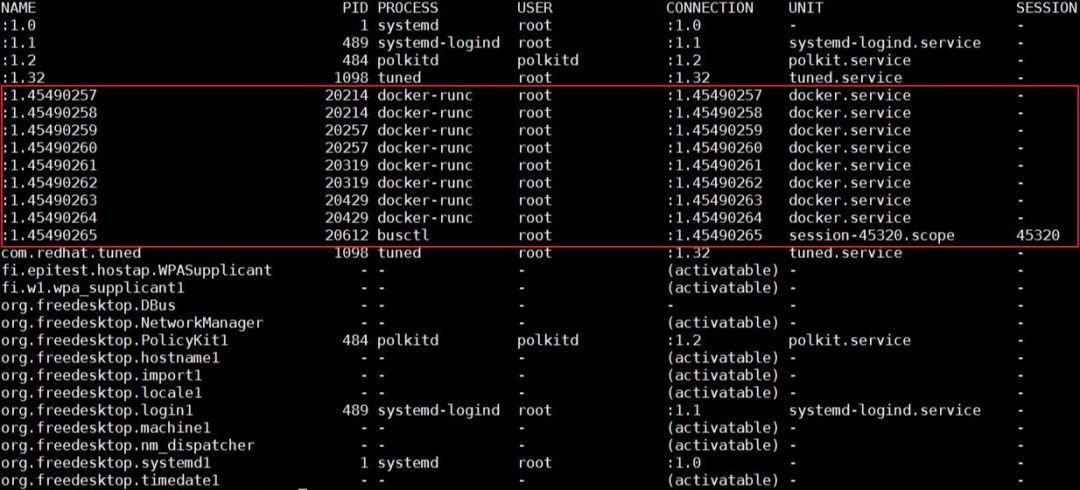 我们可以使用 busctl 命令列出系统现有的所有 bus 。如下图,在问题发生的时候,我看到问题节点 bus name 编号非常大。所以我倾向于认为,dbus 某些相关的数据结构,比如 name,耗尽了引起了这个问题。