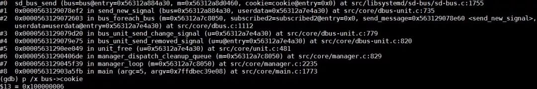 我们使用 gdb 打印出 dbus->cookie 这个值,可以很清楚看到,这个值超过了0xffffffff 。所以看起来,问题是 systemd 在加封过大量 message 之后,cookie 这个值32位溢出了,导致新的消息不能被加封,从而使得 systemd 对 runC 没有了响应。