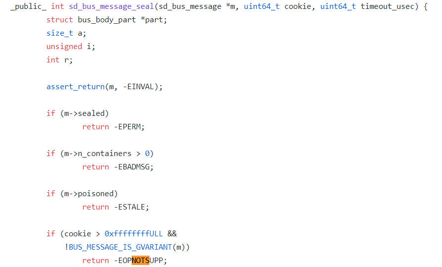 在征求用户同意之后,下载 systemd 调试符号,挂载 gdb 到 systemd 上,在可疑的函数下断点,continue 继续执行。经过多次验证,发现 systemd 最终踩到了sd_bus_message_seal 这个函数里的 EOPNOTSUPP 报错。