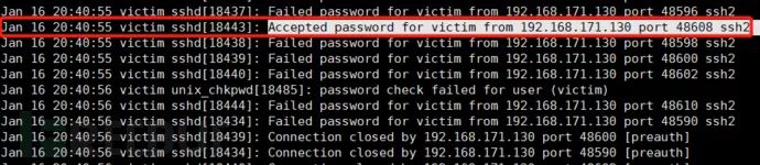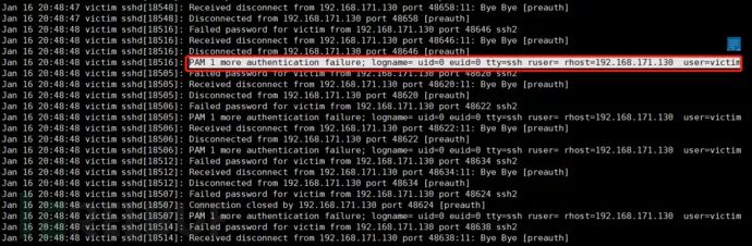 Jan 14 07:37:08 victim unix_chkpwd[54691]: password check failed for user (victim)Jan 14 07:37:08 victim sshd[54689]: pam_unix(sshd:auth): authentication failure; logname= uid=0 euid=0 tty=ssh ruser= rhost=192.168.171.130 user=victimJan 14 07:37:10 victim sshd[54689]: Failed password for victim from 192.168.171.130 port 48548 ssh2