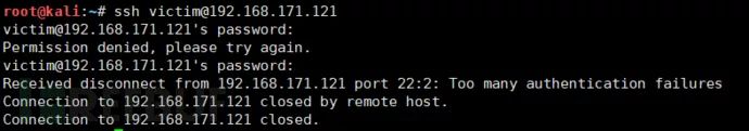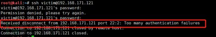 2)检测发现目标主机存在ssh服务,尝试登陆几次判断是否存在登陆次数限制或登陆地址限制情况:
